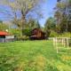 木製チップを敷き詰めた広いドッグランの中のコテージ。
